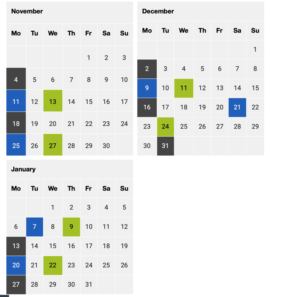 Bin days for next 3 months (November 2024-January 2025) are shown here – including the all-important Christmas schedule!